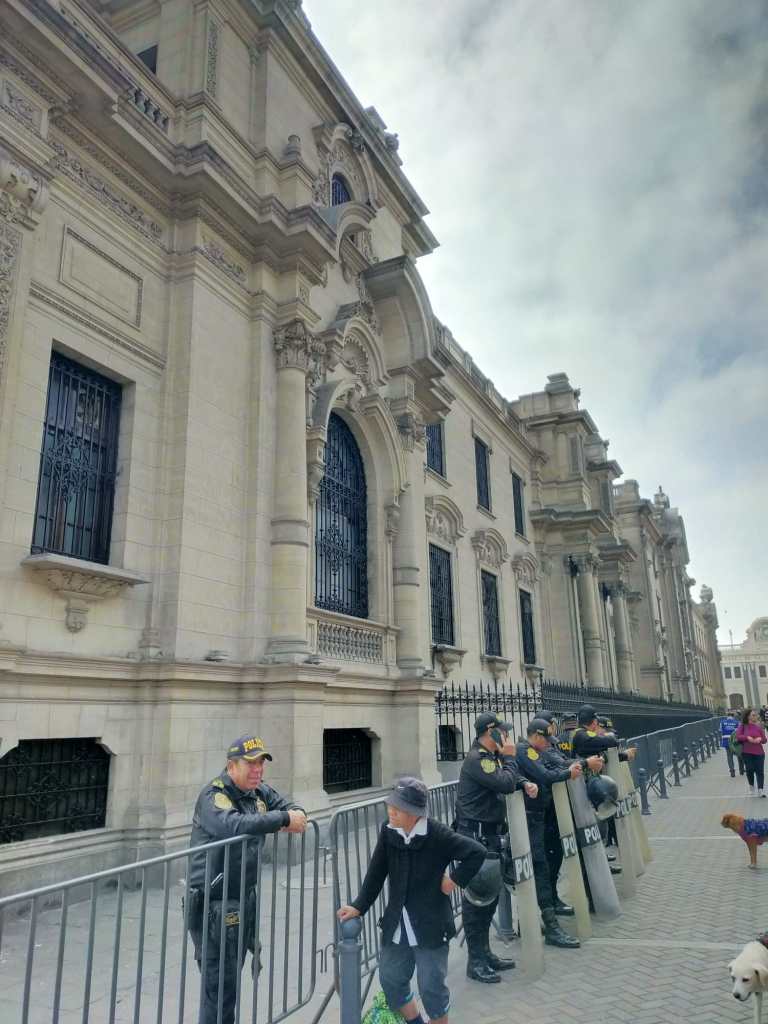 Il Presidente infatti è odiatissima dai peruviani, soprattutto nel sud del paese. Secondo gli ultimi sondaggi, Dina Boluarte avrebbe solo il 3% di approvazione popolare. Pacifiche proteste giornaliere si svolgevano fino a fine agosto di fronte alla sede del governo, dov’è stato tutto transennato e vige la presenza di poliziotti. Qui sotto la foto.