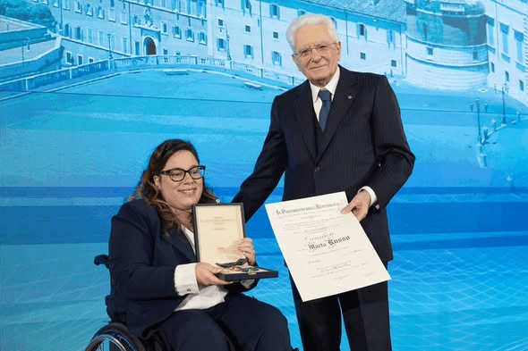 In Italia il 26 febbraio la famosa attivista per i disabili e influencer Marta Russo viene premiata come Cavaliere della Repubblica Italiana dal presidente Sergio Mattarella. (Fonte: Profili Social di Marta Russo)